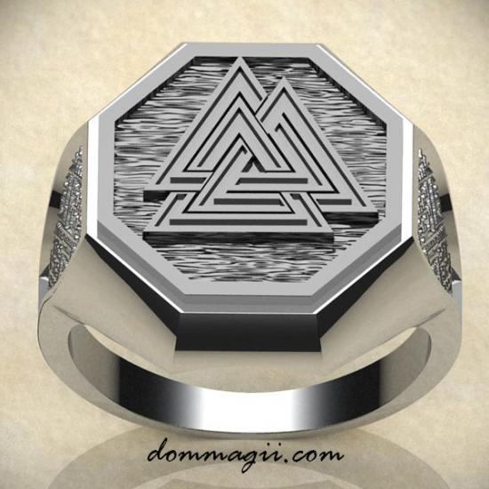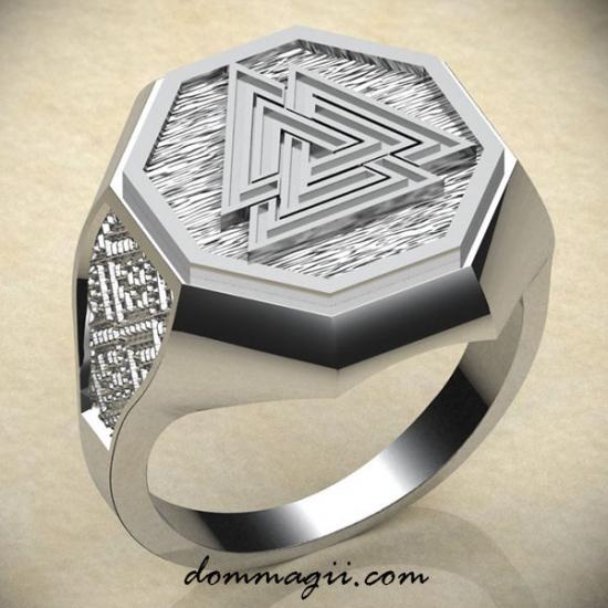 Вальунут состоит из трёх взаимопереплетённых треугольников — неразрывных, словно три уровня бытия: тело, душа, дух. Это путь жертвы, путь знания и путь перерождения. В нём — сила воина, боль утрат и торжество духа. Такой символ не надевают случайно. Его выбирают сознательно. И кольцо с Вальунутом — это заявка на то, что вы не бегаете от испытаний, а проходите сквозь них.
