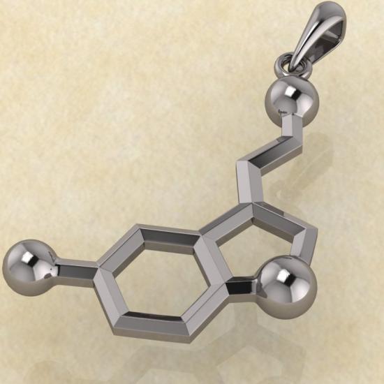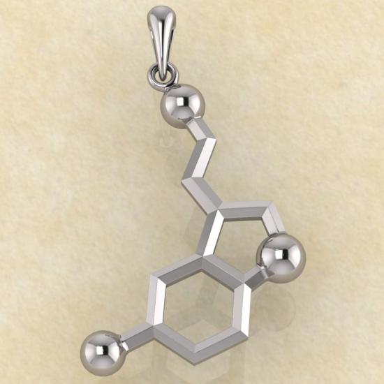 Ювелирные изделия на медицинскую или научную тематику набирают популярность. Кулон в виде «Гормона счастья», который можно купить на нашем сайте, является прекрасным и уникальным ювелирным изделием. Кулон качественно выполнен из серебра и является точной копией серотонина.