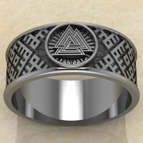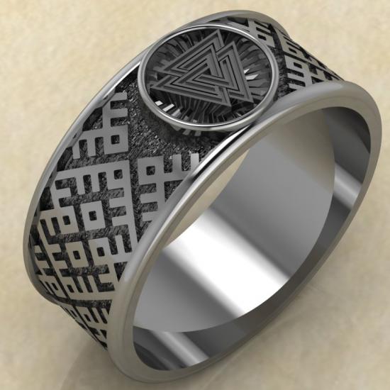 В нашем интернет-магазине можно купить перстень Валькнут из серебра. Графическое изображение Валькнута представлено в виде трёх треугольников, связанных воедино. Связанные треугольники олицетворяют теорию трёх миров –