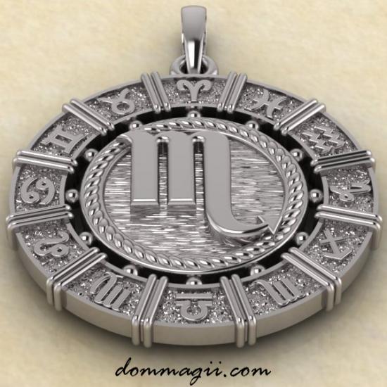 — на одной стороне подвески — астрологический символ Скорпиона — острый, чёткий, пронзающий, как хвост самого знака;