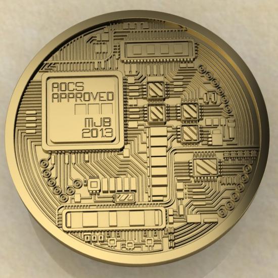 Аверс — выпуклый ₿, окружённый трёхуровневым кольцом дорожек микросхемы: внешний круг — «узлы», средний — «майнеры», внутренний — «ядро». Всё читается даже под тёплой лампой.
