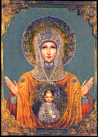На иконе Божией Матери, именуемой «Знамение» изображена сидящая Пресвятая Богородица, которая молитвенно поднимает руки. На фоне круглой сферы на уровне ее груди изображен Божественный Младенец (Спас-Эммануил). Иконы «Знамение» появились на Руси в двенадцатом веке. Предпосылкой их возникновения стало знамение от Новгородской иконы (1170 год).