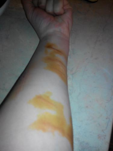 Пять огромнеющих царапин с внутренней стороны, кошка рядом не стояла. Самая большая проходит прямо по вене. Три вместе, две чуть поодаль. Больно.
