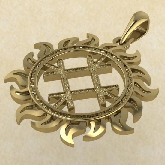Серебро отражает, а золото притягивает. Мы, в мастерской Brokka, взяли шершавый рисунок старого берестяного «целебного» знака и талицким огнём вплавили в круг из солнечного металла. Лучи подняли ребро, будто кованые язычки пламени, а центр оставили гладким: там сияет травяной крест, готовый впитать свет фонарей мегаполиса и превратить его в спокойный пульс вашего организма.