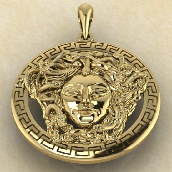 Лицо Медузы выполнено с микроскопическими порами кожи, чтобы золото не выглядело бездушным. Змеи-волосы закручены и выгравированы так, что даже под лупой заметна каждая чешуйка. Внутри головы – пустое пространство, куда попадает и застывает всё чужое злое слово. Благодаря зеркальной полировке щёк и лба свет бьёт отблесками, а матовое сатинирование змеиного тела создаёт контраст — словно наглая мысль наскочила на бархатную, но неумолимую стену.